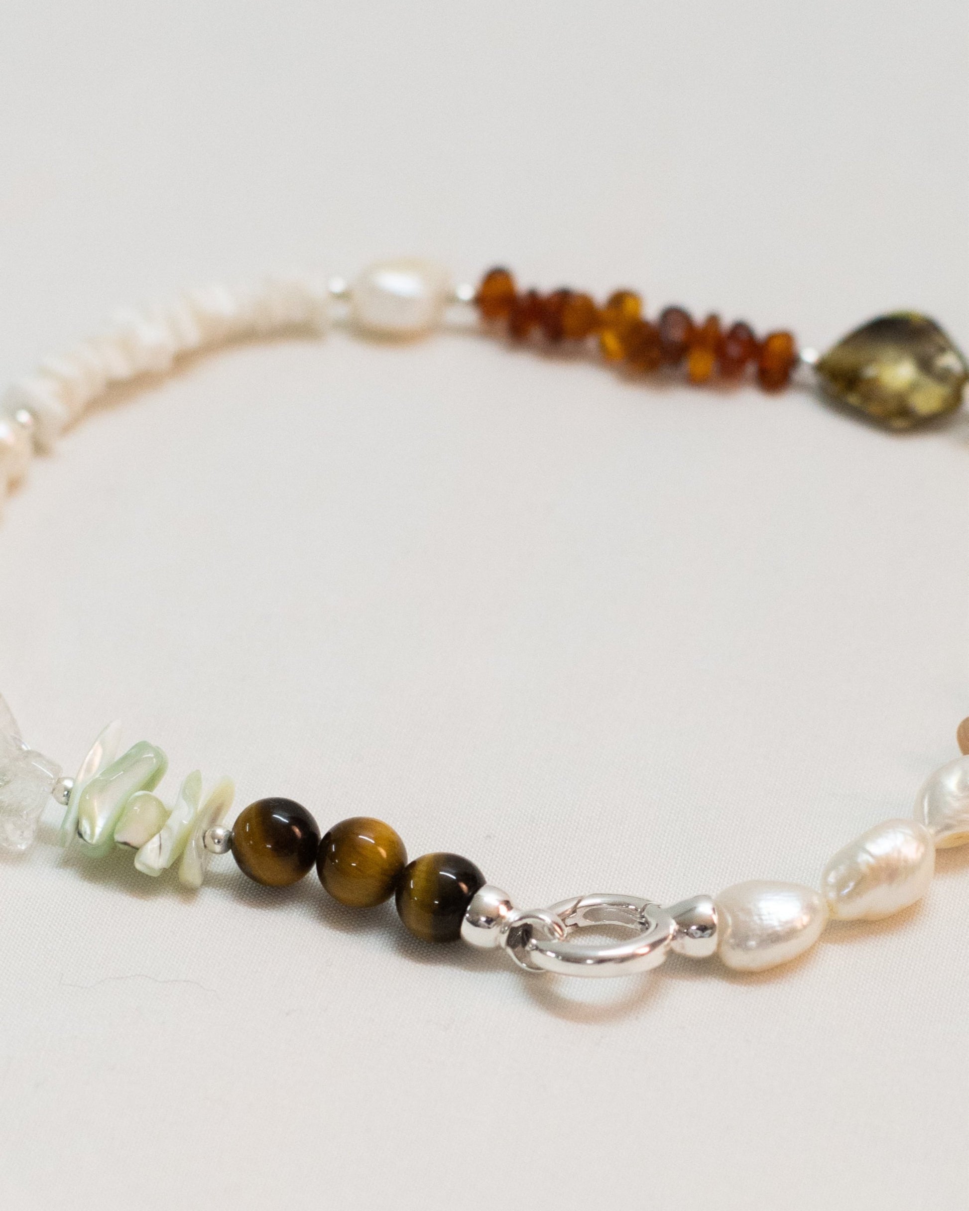 Echte Süßwasserperlen, Tiegerauge, Bernstein, Perlmutt, Bergkristall, echte Silberperlen.